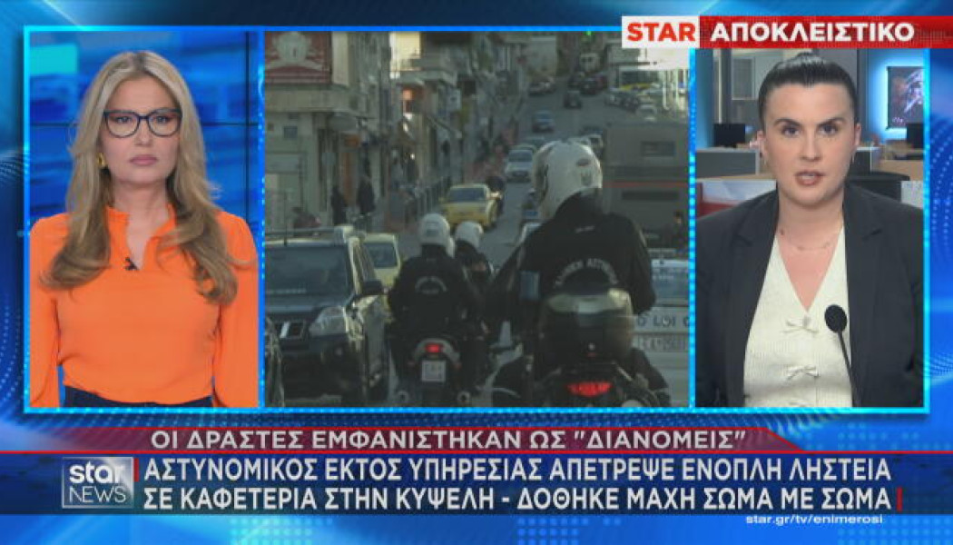 Αστυνομικός εκτός υπηρεσίας απέτρεψε ληστεία σε καφετέρια στην Κυψέλη. Δόθηκε μάχη σώμα με σώμα, σύμφωνα με το αποκλειστικό ρεπορτάζ της Κατερίνας Ρίστα στο μεσημεριανό δελτίο ειδήσεων του Star. Δύο άνδρες, που φορούσαν κράνη και full face και κρατούσαν κουτιά με πίτσες, προσποιούμενοι τους διανομείς, μπήκαν σε καφετέρια στην Κυψέλη. Ο ιδιοκτήτης και οι θαμώνες κοιτάζοντάς τους, αντιλήφθηκαν ότι κάτι δεν πήγαινε καλά.