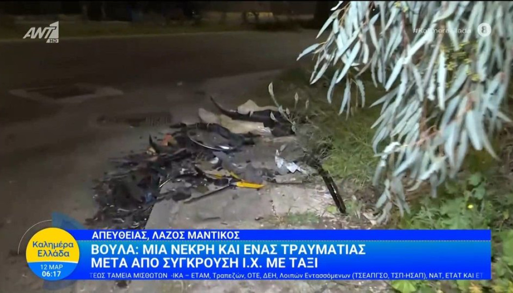 Ένα ακόμα θανατηφόρο τροχαίο σημειώθηκε λίγο μετά τα μεσάνυχτα στη Βούλα, στη συμβολή της λεωφόρου Καραμανλή με την οδό Ευελπίδων. Ένα ΙΧ αυτοκίνητο, συγκρούστηκε πλαγιομετωπικά με ένα ταξί, με αποτέλεσμα να βρει τραγικό θάνατο μια 55χρονη.