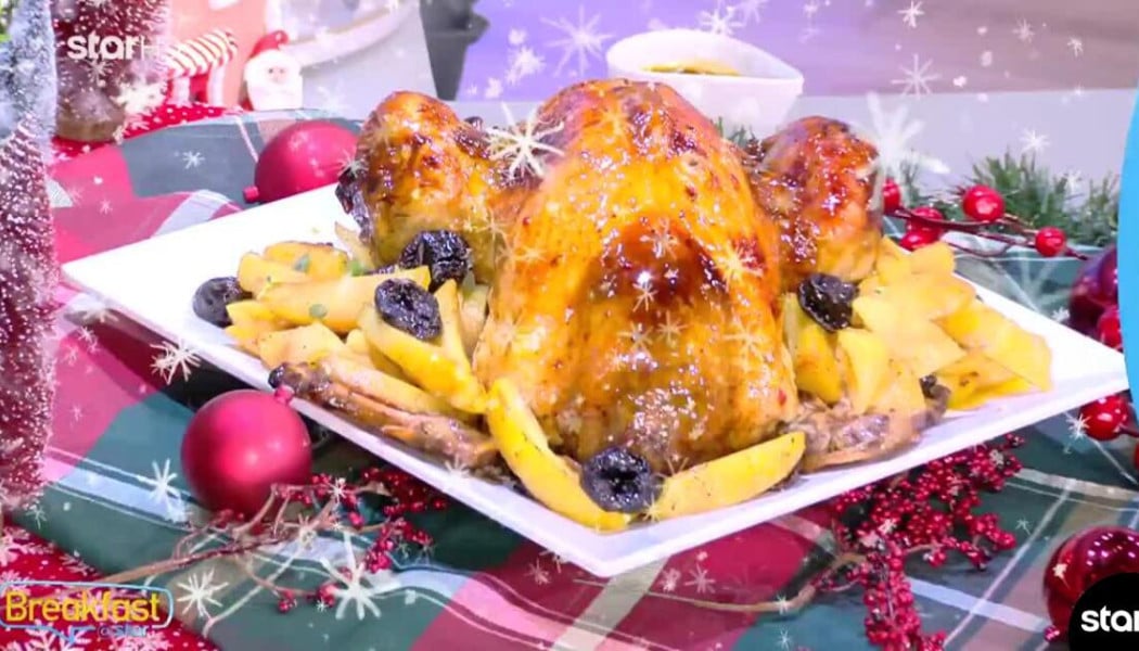 O σεφ μπήκε στην κουζίνα, ετοίμασε γαλοπούλα με χριστουγεννιάτικη γέμιση και έδειξε βήμα-βήμα στους τηλεθεατές τη διαδικασία.