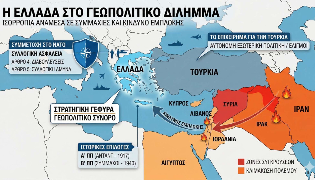 Η απάντηση δεν είναι απλή. Η Ελλάδα δεν βρίσκεται στο κέντρο της Μέσης Ανατολής, όμως βρίσκεται στο γεωπολιτικό σύνορο της Ανατολικής Μεσογείου, μια περιοχή που λειτουργεί ως στρατηγική γέφυρα ανάμεσα στην Ευρώπη και τις ζώνες των συγκρούσεων.