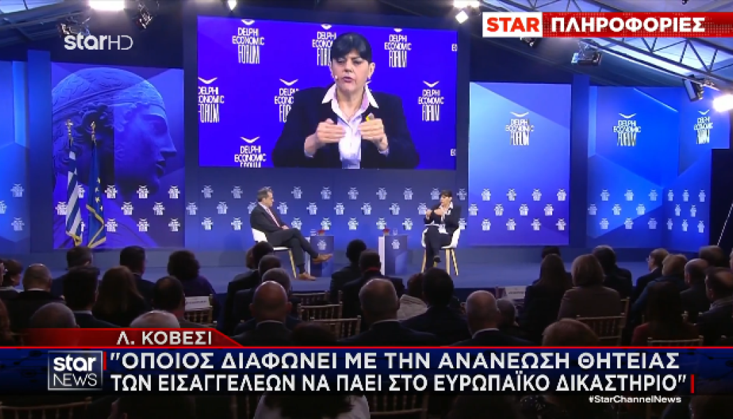 Η Ευρωπαία Εισαγγελέας Λάουρα Κοβέσι μίλησε σήμερα στο Delphi Forum και έδωσε απαντήσεις για όλα. «Άδειασε» τους Έλληνες πολιτικούς για τις επιθέσεις που κάνουν στους Ευρωπαίους εισαγγελείς με φόντο τις δικογραφίες για τον ΟΠΕΚΕΠΕ, αλλά και τα κυβερνητικά στελέχη για την ανανέωση της θητείας των Ελλήνων δικαστών που υπηρετούν τον ευρωπαϊκό θεσμό.