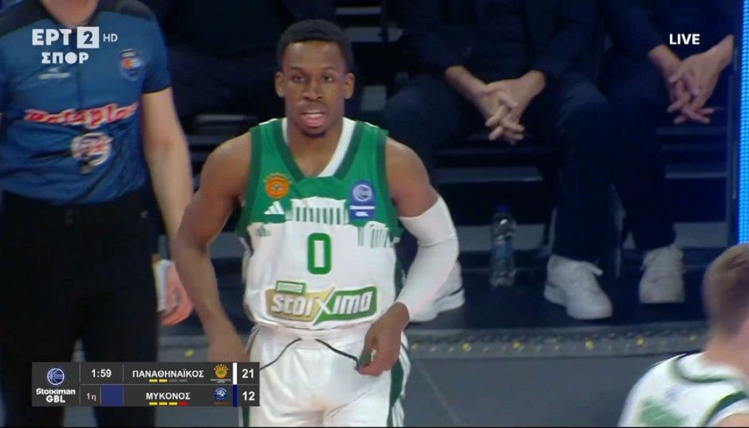 Ο κοντύτερος παίκτης του Παναθηναϊκού έκοψε ψηλά τον Κάναντι σε προσπάθεια για σουτ τριών πόντων, αναδεικνύοντας τα τρομερά αθλητικά του προσόντα