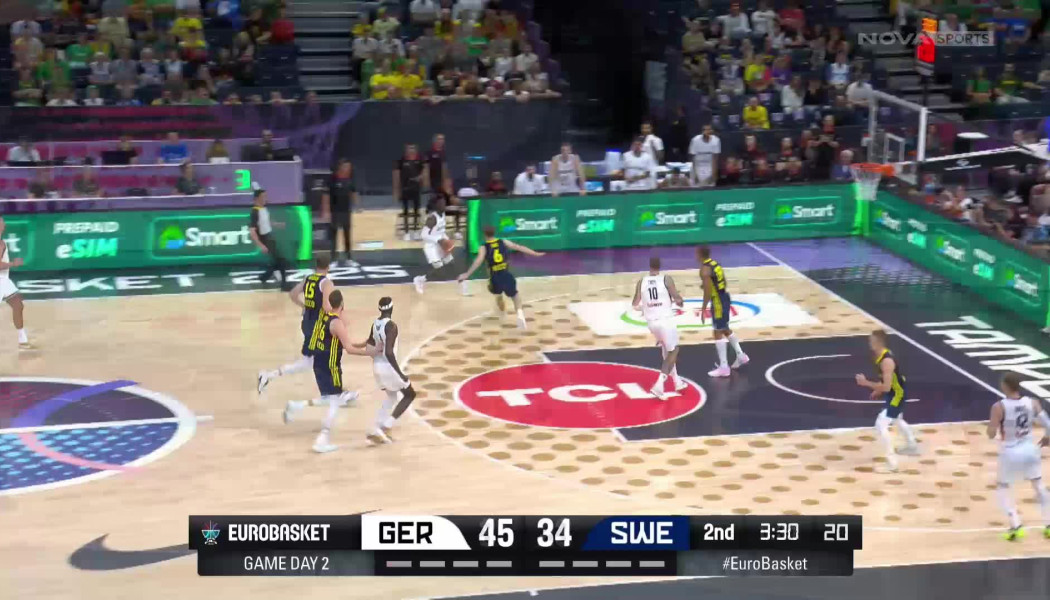 Και πάλι με τον Άλαν Ιμπραχίμαγκιτς στον πάγκο τους (εξακολουθεί και είναι κλινήρης ο Άλεξ Μουμπρού) οι Γερμανοί πέτυχαν 59 πόντους στο πρώτο ημίχρονο έχοντας ως πυλώνες τον Φραντς Βάγκνερ και τον Ντένις Σρέντερ, οι Σουηδοί στηρίχτηκαν στα τρίποντα του Πάντζαρ αλλά φυσικά μπροστά στον πλουραλισμό των Γερμανών δεν είχαν απαντήσεις.