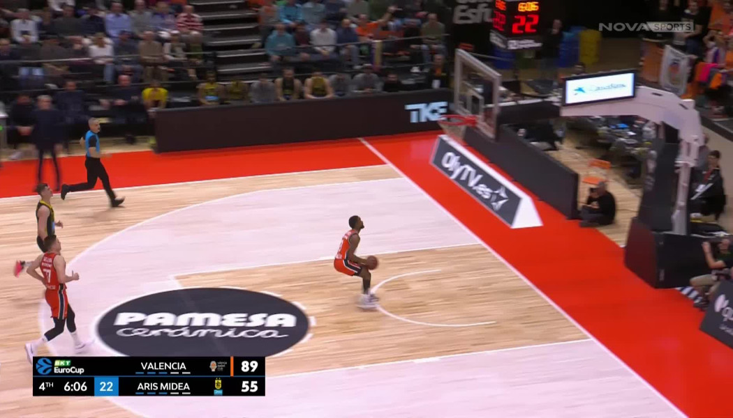 Ο Χατζηδάκης μείωσε για τον Άρη στους 10 (28-18) αλλά ο Σεστίνα ευστόχησε από τα 6,75μ. δύο φορές και διαμόρφωσε το 34-18. Ο Φιγκερόα «απάντησε» έμμεσα στο ένα τρίποντο αλλά τότε η Βαλένθια βρήκε ένα σερί 4-0 με τους Λόπεθ-Αροστέγκι και Γιόβιτς και προηγήθηκε με 38-21. Ο Τολιόπουλος με τρίποντο έκανε το 38-24 αλλά οι γηπεδούχοι με ακόμη ένα σερί 12-0 έφτασαν στο +26 (50-24). Φιγκερόα και Ρόμπερτς μείωσαν σε 50-28 αλλά ο Μοντέρο με τρίποντο έκανε το 54-30. Τελικά, η Βαλένθια πήγε στα αποδυτήρια με το υπέρ της 55-33.