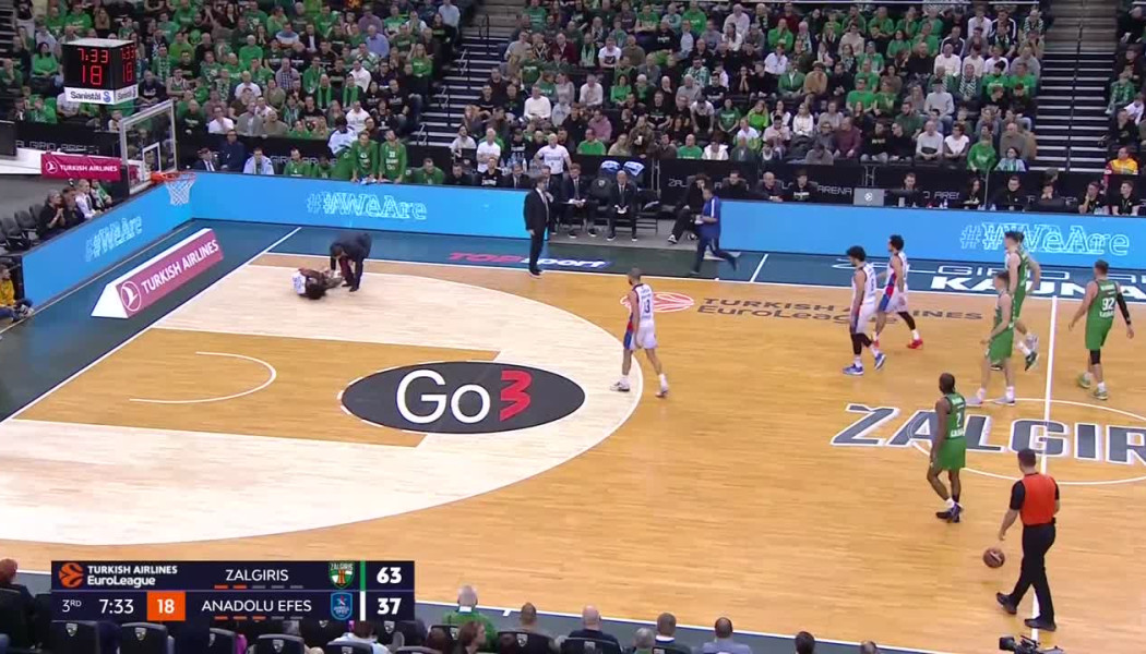 Ο σέντερ της τουρκικής ομάδας, Οτούρου τραυματίστηκε στο γόνατο και ήταν σωριασμένος στο παρκέ με τη Ζαλγκίρις εκείνη τη στιγμή να κάνει επίθεση.