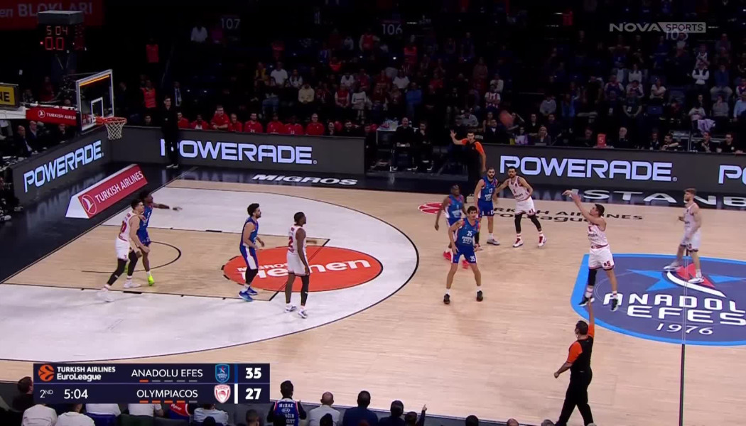 Εφές - Ολυμπιακός: Οι Πειραιώτες σημείωσαν το 35-30 χάρη σε μαγικό τρίποντο του Γιαννούλη Λαρεντζάκη, ο οποίος σούταρε σχεδόν από το κέντρο του γηπέδου και ευστόχησε σε τρίποντο!