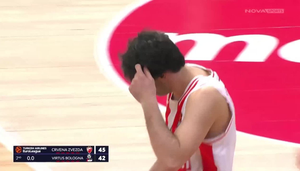 Με 14 δευτερόλεπτα να απομένουν για το ημίχρονο, ο Ερυθρός Αστέρας είχε επίθεση με το σκορ στο 42-42 και απέμενε και λίγος χρόνος στην Βίρτους Μπολόνια. Ο Μίλος Τεόντοσιτς έδωσε μια πάσα στον Τόμπι χωρίς να βλέπει και αυτός έβαλε το τρίποντο για το 45-42.
