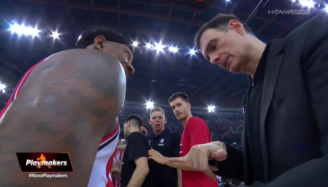 Ο Γιώργος Μπαρτζώκας μετά το τέλος του αγώνα και την κατάληψη της πέμπτης θέσης στη Euroleague, έδειχνε στον Κάνααν πως είχε γίνει το δάχτυλο του, ενώ με γουρλωμένα μάτια κοίταζαν ο Τανούλης και ο Πετρούσεφ.
