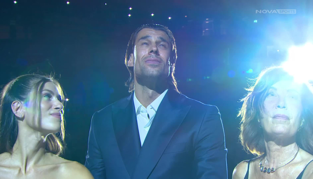 Συγκλονιστικές στιγμές στο ΣΕΦ, με χιλιάδες φίλους του Ολυμπιακού να αποθεώνουν τον Γιώργο Πρίντεζη κατά την απόσυρση της φανέλας του.