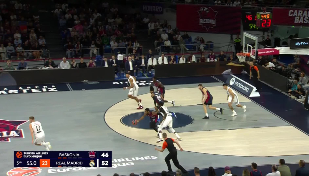 Η αστοχία της Ρεάλ στο πρώτο ημίχρονο έδωσε την ευκαιρία στους Βάσκους να προηγηθούν με +5 με το τρίποντο του Μονέκε στο 14’. Οι «μερένχες» βρήκαν τις λύσεις με τους Μούσα και Ντεκ κι έφτασαν στο 35-36 στην ολοκλήρωση του ημιχρόνου.