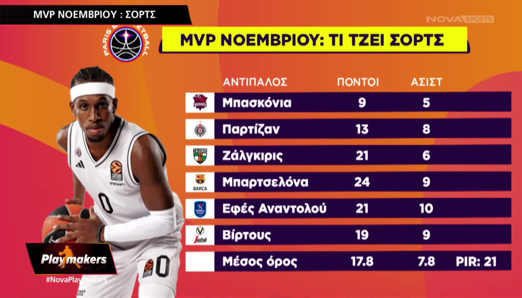 Ο Τι Τζέι Σορτς αναδείχθηκε πολυτιμότερος παίκτης του Νοεμβρίου της EuroLeague.