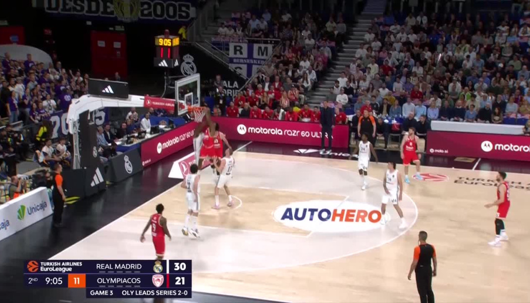 Η Ρεάλ Μαδρίτης επικράτησε επί του Ολυμπιακού με 80-72 μειώνοντας σε 2-1 τη σειρά και ο Σερτζ Ιμπάκα πρόσφερε μια θεαματική φάση.
