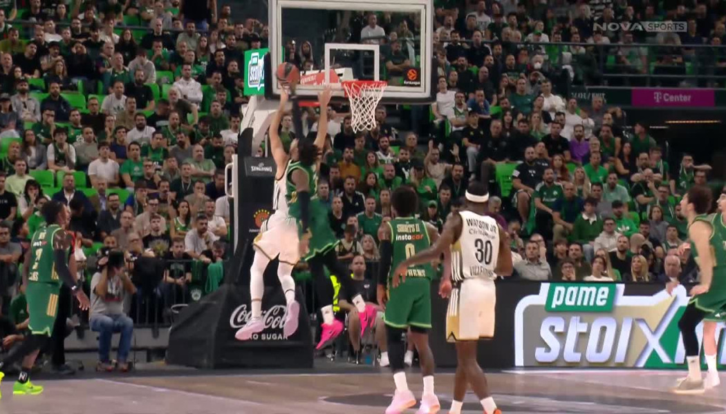 Παναθηναϊκός - Βιλερμπάν: Ο Βοτιέ προσπάθησε να σκοράρει με λέι απ, όμως υπολόγιζε χωρίς τον Ρισόν Χολμς, ο οποίος σηκώθηκε ψηλά και τον έκοψε εμφατικά.