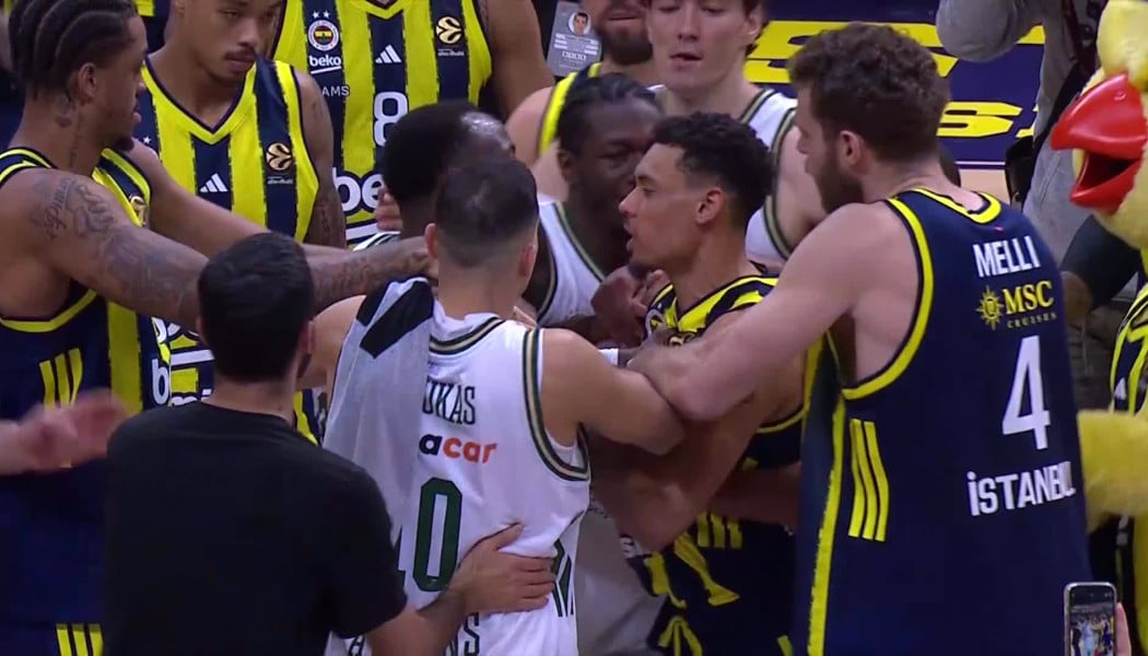 Ο γκαρντ της Φενέρμπαχτσέ επιχείρησε να απομακρύνει τον αντίπαλό του από το κέντρο του γηπέδου και το λογότυπο της Φενέρμπαχτσε.