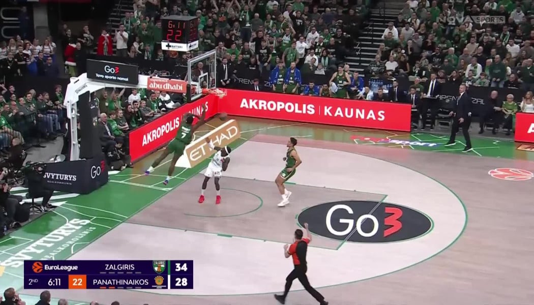Ζαλγκίρις - Παναθηναϊκός: Ο Κέντρικ Ναν χρεώθηκε με αντιαθλητικό φάουλ, καθώς σταμάτησε τον Μόουζες Ράιτ σε αιφνιδιασμό, με τον σέντερ της Ζαλγκίρις να πέφτει πολύ άσχημα στο παρκέ, αλλά ευτυχώς να μην τραυματίζεται σοβαρά.