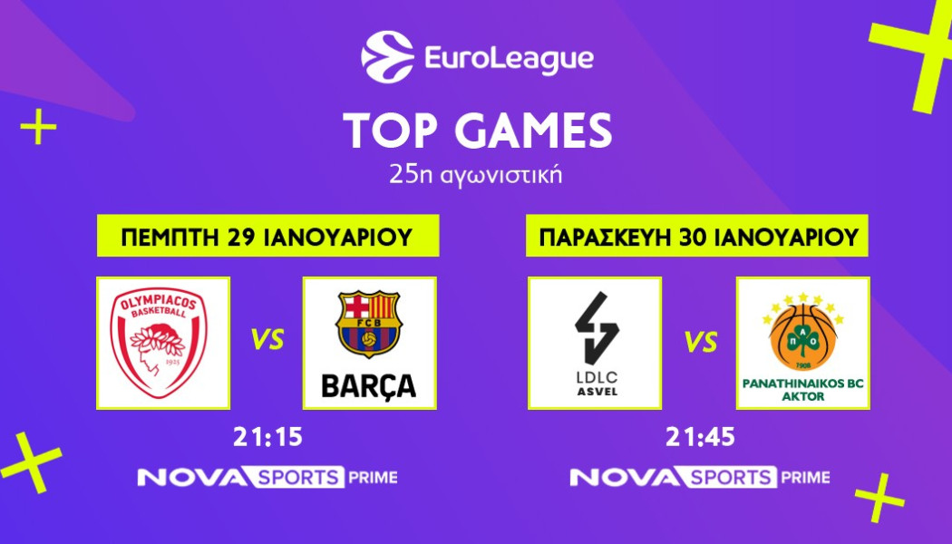 Στην κορυφαία ευρωπαϊκή διασυλλογική διοργάνωση, στην EuroLeague και για την 24η αγωνιστική, o Ολυμπιακός υποδέχεται στο ΣΕΦ την Μπαρτσελόνα (29/1, 21:15) ενώ ο Παναθηναϊκός AKTOR ταξιδεύει για τη Γαλλία και την αναμέτρηση με τη Βιλερμπάν (30/1, 21:45).