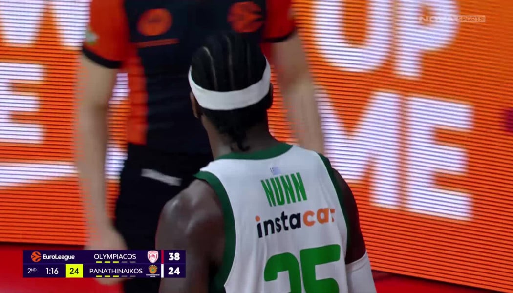 Ολυμπιακός - Παναθηναϊκός: Ο Κέντρικ Ναν έφυγε στον αιφνιδιασμό και σκόραρε πάνω στην άμυνα του Άλεκ Πίτερς μειώνοντας σε 38-24 για τον Παναθηναϊκό.