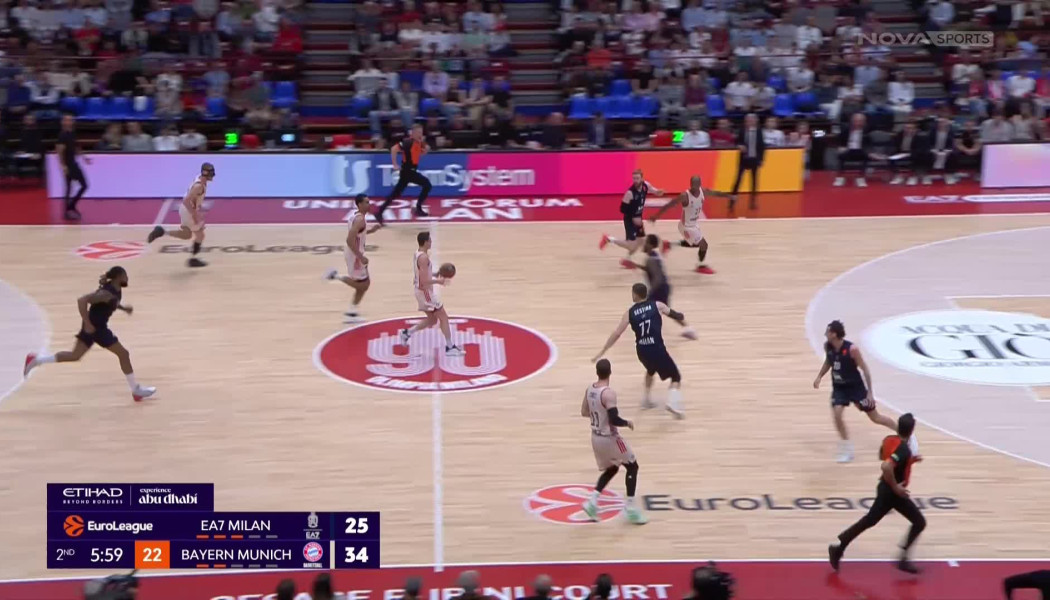 Με τον καλύτερο δυνατό τρόπο μπήκε η Μπάγερν, με τον Μάικ να σκοράρει συνεχόμενα μέσα από την ρακέτα για το +5 (23-28 στο 12’). Οι παίκτες του Πέσιτς είχαν φέρει το παιχνίδι στα μέτρα τους και με επιμέρους 3-11 μεγάλωσαν την διαφορά στο +8 (23-31 στο 13’), με την Αρμάνι να έχει χάσει τελείως την συγκέντρωση της. Ο Μάικ έκανε ότι ήθελε στο παρκέ, έφτασε τους 12π. εκτοξεύοντας την διαφορά σε διψήφια επίπεδα (+15, 25-40 στο 15’). Οι φιλοξενούμενοι έπαιρναν πράγματα από πολλούς παίκτες, ο Ντα Σίλβα έδινε λύσεις (8π.) με την Βαυαρική ομάδα να κλείνει το πρώτο μέρος στο +18 (34-52), πραγματοποιώντας φοβερή εμφάνιση στο δεύτερο δεκάλεπτο.