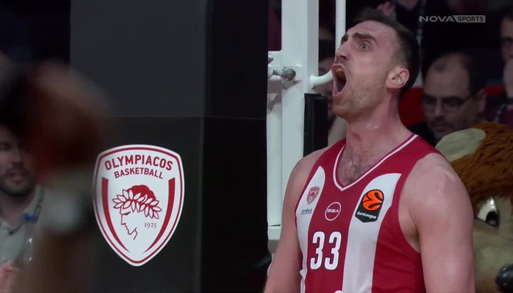 Σε μια γρήγορη μετάβαση από τους Πειραιώτες ο Νίκολα Μιλουτίνοφ κάρφωσε το καλάθι και πήρε και το φάουλ.