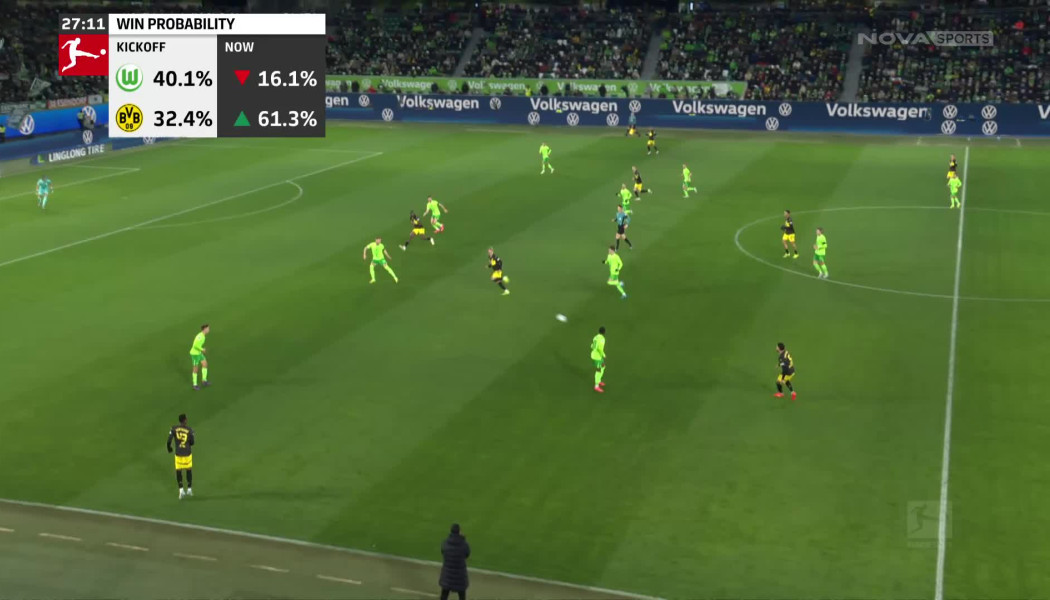 Ούτε ο πιο αισιόδοξος φίλος της Ντόρτμουντ δεν θα περίμενε αυτό που συνέβη στο πρώτο ημίχρονο με την Βόλφσμπουργκ. Η Ντόρτμουντ με τρία γκολ σε έξι λεπτά προηγήθηκε με 3-0 μέσα στην Βόλκσβαγκεν Αρένα με σκόρερς Μάλεν (25′), Μπάιερ (28′) και Μπραντ (30′) και έδειχνε έτοιμη για την πρώτη εκτός έδρας νίκη της χρονιάς.