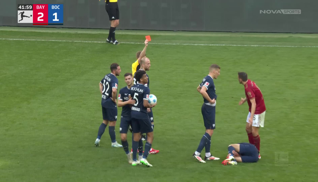 Με το σκορ στο 2-1 υπέρ της κόντρα στη Μπόχουμ, η Μπάγερν Μονάχου έμεινε με παίκτη λιγότερο από το 43', όταν ο Παλίνια πάτησε τον Γιώργο Μασούρα και αντίκρισε την απευθείας κόκκινη κάρτα.