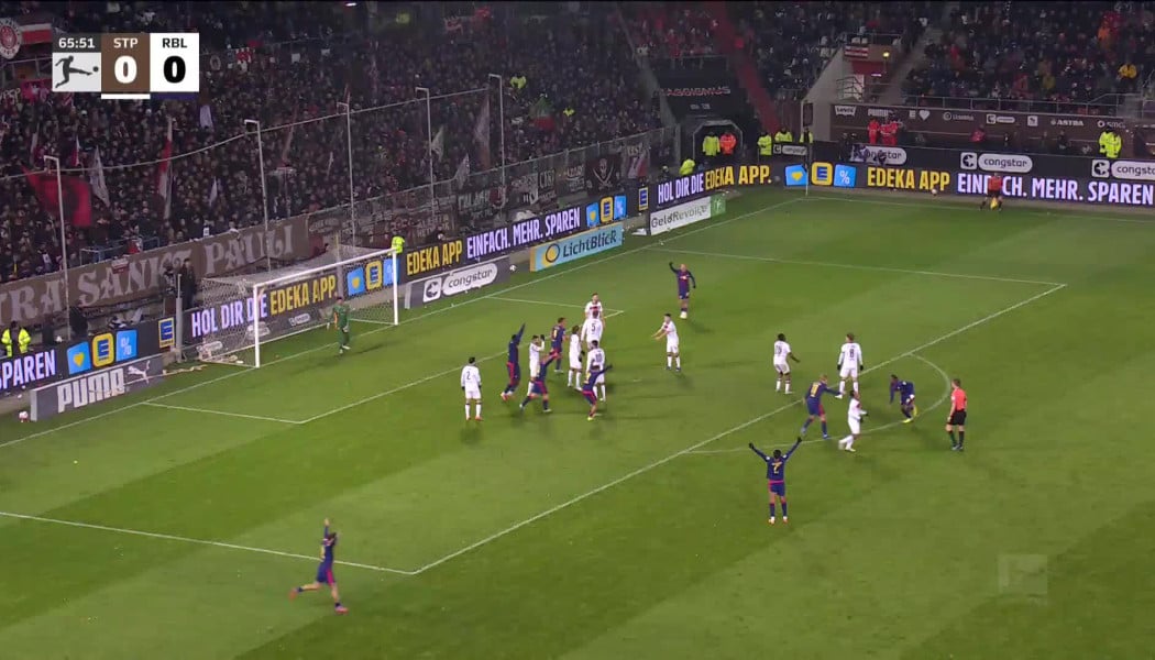 Η Λειψία προηγήθηκε στο 66ο λεπτό της αναμέτρησης με τη Ζανκτ Πάουλι, όταν μετά από εκτέλεση κόρνερ η μπάλα κατέληξε στον Ντιομαντέ, ο οποίος από το ύψος της περιοχής με δυνατό σουτ άνοιξε το σκορ αφήνοντας άγαλμα τον τερματοφύλακα.