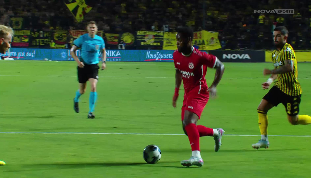Αράζ: Τρομερά πράγματα στη Θεσσαλονίκη, μιας και μια "βουτιά" από πλευράς Σιμακάλα, σε διεκδίκηση της μπάλας με τον Μόντσου μέσα στην περιοχή, έκανε τον διαιτητή να δώσει πέναλτι στους Αζέρους, μιας και η φάση δεν μπορούσε να ελεγχθεί ξανά αφού δεν υπάρχει VAR σε αυτή τη φάση του Conference League.