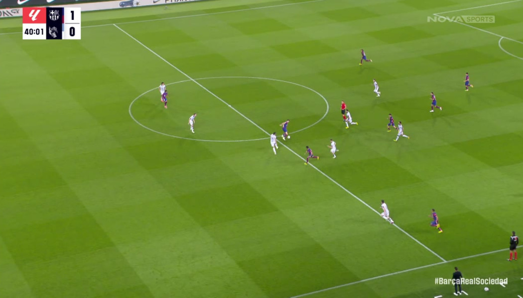 Στο 40', ο Ρόμπερτ Λεβαντόφσκι με μια εξαιρετική κάθετη πάσα στον Ιλκάι Γκιντογκάν έκοψε στη μέση τους Βάσκους και ο Γερμανός χαφ γύρισε την μπάλα την κατάλληλη στιγμή στον Λαμίν Γιαμάλ για να νικήσει τον Ρεμίρο και να ανοίξει το σκορ.