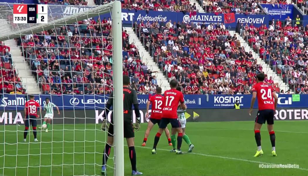 Οι «βερδιμπλάνκος» σημείωσαν σημαντική νίκη με 2-1 στην Παμπλόνα και έπιασαν την αντίπαλό τους στην έκτη θέση της κατάταξης. Ο Βίτορ Ρόκε στο 7΄ και ο Τσίμι Αβιλα στο 73΄ πέτυχαν τα γκολ για την ομάδα του Μανουέλ Πελεγκρίνι, που τελείωσε το ματς με δέκα παίκτες, λόγω αποβολής του Νατάν στις καθυστερήσεις. Οι γηπεδούχοι, που «σπατάλησαν» αρκετές ευκαιρίες, είχαν ισοφαρίσει προσωρινά στο 59΄ με τον Τορό.
