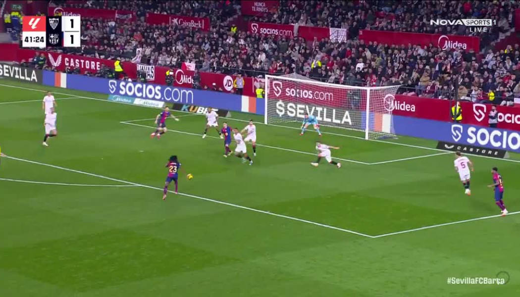 Στο 42’ ο αμαρκάριστος Γιαμάλ με ένα ωραίο τακουνάκι τροφοδοτεί τον Κουντέ αλλά το σουτ του Γάλλου περνά πάνω από το οριζόντιο δοκάρι.