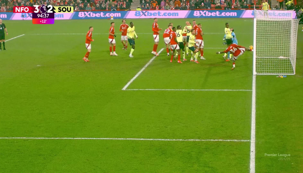 Φοβερή φάση στο 90'+4’, ο Μπέντναρεκ κάνει την κεφαλιά, ο Άινα διώχνει στη γραμμή και κρατάει το 3-2 για τη Νότιγχαμ Φόρεστ απέναντι στη Σαουθάμπτον.