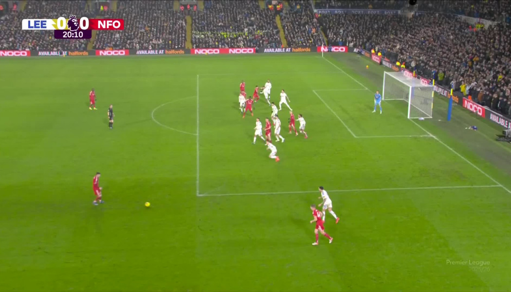 Το 1-0 για την Λιντς ο Μπογκλ στο 26΄ μετά από καταπληκτική πάσα του Γκρούεφ για να γίνει το 2-0 στο 30΄ με τον Οκαφόρ μετά από προσπάθεια στην εστία του Τζάστιν και ασίστ στον σκόρερ, για την γηπεδούχο που είχε και δοκάρι με τον Κάλβερτ-Λούιν στο 24′ στο καλό δημιουργικά διάστημά της. Η Νότιγχαμ απείλησε μετά το δεκάλεπτο με Οντόι, Ντομίνγκες και Γκιμπς-Γουάιτ, αλλά οι κλασικές στην εστία ευκαιρίες της από το 10′ έως το 13′ σταμάτησαν στον τερματοφύλακα Ντάρλοου. Το τελικό 3-1 ο Λούκα στο 86′ μετά από σέντρα του Χάτσινσον.