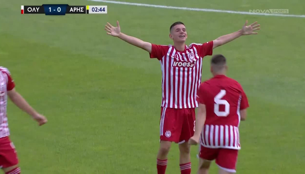 O Ολυμπιακός τσέκαρε το πρώτο χρονικά εισιτήριο για τον τελικό του πρωταθλήματος της Super League K15, επικρατώντας 3-1 του Άρη στο ΔΑΚ Λαμίας “Αθανάσιος Διάκος”, στο οποίο πραγματοποείται το Final 4 της διοργάνωσης. Σκόρερ οι Παπαγεωργίου (3′), Σώζιος (33′), Λαζαρίδης (55′), για τον Άρη μείωσε ο Παπασαραφιανός (45+1′).