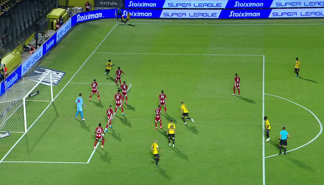 Αρχικά οι Πειραιώτες εκφράζουν διαμαρτυρίες για τον καταλογισμό φάουλ σε βάρος του Ντόη λίγο πριν το γκολ του Άρη. Από εκεί ουσιαστικά ξεκινά η φάση του γκολ, μιάς και μετά την εκτέλεση του φάουλ, προκύπτει το κόρνερ, από την εκτέλεση του οποίου ο Μορόν σκοράρει σε δεύτερο χρόνο.