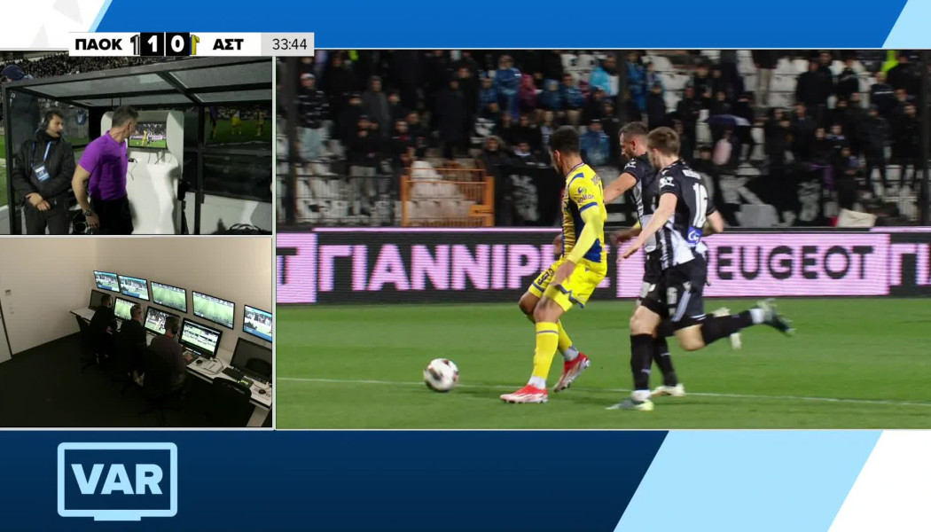 ΠΑΟΚ - Αστέρας Τρίπολης: Ο Τζοακίνι έπεσε στη μεγάλη περιοχή του ΠΑΟΚ μετά από μαρκάρισμα του Βιετέσκα, με τον Τάσο Σιδηρόπουλο να υποδεικνύει αρχικά πέναλτι για τον Αστέρα Τρίπολης αλλά να αλλάζει απόφαση μετά από παρέμβαση του VAR.
