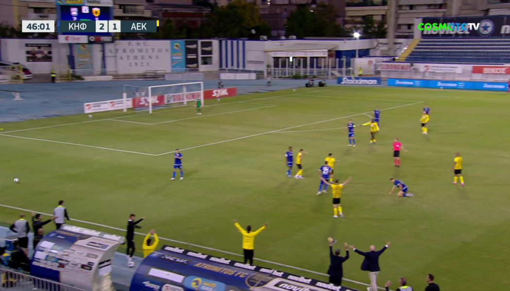 ΑΕΚ: "Φωνές" της Ένωσης στο Περιστέρι, μιας και στο 46' μετά από προσπάθεια του Κολασκάμη η μπάλα από κεφαλιά του Έμπο, θα χτυπήσει στο χέρι του Πέρεθ, με τον διαιτητή να δείχνει συνέχεια στο παιχνίδι, έπειτα και από τη χρήση του VAR.