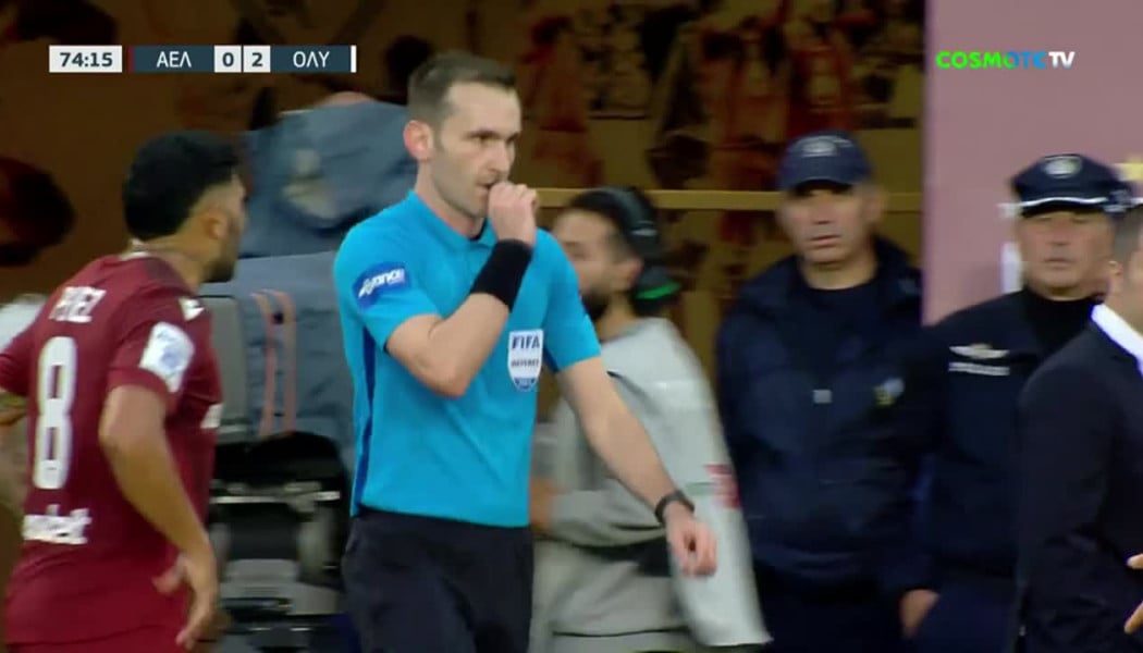 Ο Μούργος έπεσε στο χορτάρι μετά από μοναμαχία με τον Μάνσα στη μεγάλη περιοχή του Ολυμπιακού. Ο διαιτητής Τσακαλίδης έδωσε πέναλτι, ωστόσο έπειτα από εξέταση της φάσης στο ριπλέι διαπίστωσε πως ο Βραζιλιάνος αμυντικός βρήκε την μπάλα και όχι τα πόδια του αντιπάλου του.