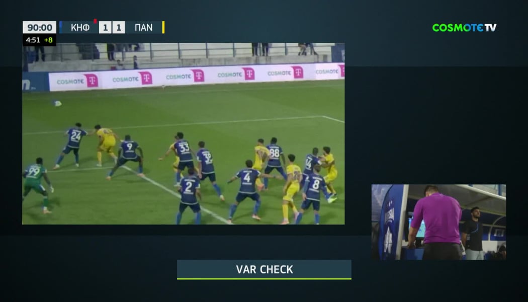 Ο κ. Κατσικογιάννης, ακολουθώντας το πρωτόκολλο, μετέβη στην οθόνη του VAR και προχώρησε σε εκτενή ανασκόπηση της φάσης. Οι παίκτες των δύο ομάδων περίμεναν με αγωνία για σχεδόν τρία λεπτά, παρακολουθώντας τον ρέφερι να επαναλαμβάνει συνεχώς το βίντεο.