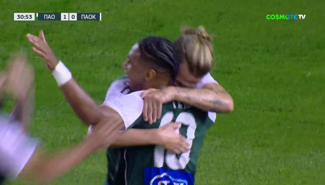 Ο Παναθηναϊκός προηγήθηκε 1-0 με τον Μίλος Πάντοβιτς και διπλασίασε τα τέρματά του με τον Τιν Γεντβάι να σουτάρει, την μπάλα να κοντράρει στο χέρι του Μεϊτέ και να καταλήγει στο βάθος της εστίας!