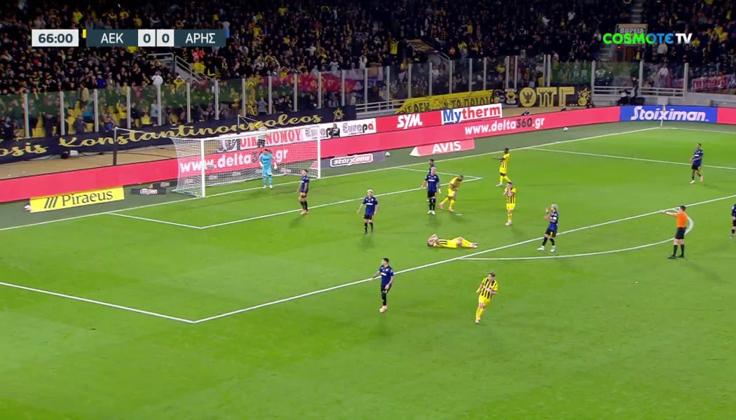 Μεγάλη διπλή ευκαιρία για την ΑΕΚ να ανοίξει το σκορ απέναντι στον Άρη, με τους Ρέλβας και Γιόβιτς να μην μπορούν να στείλουν την μπάλα στα δίχτυα
