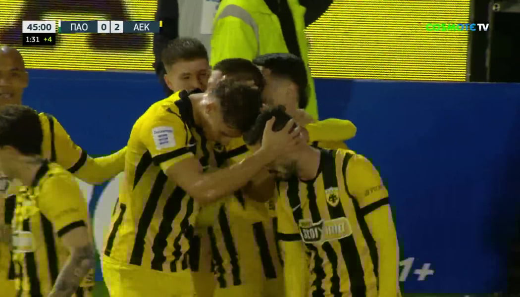 ΑΕΚ: Η Ένωση θα βρει και δεύτερη φορά δίχτυα, στο τέλος του πρώτου ημιχρόνου, όταν μετά από λάθος του Γεντβάι στη μεσαία γραμμή, ο Μάνταλος θα βρει τον Γιόβιτς, που θα μπει στην περιοχή και τον Τουμπά να τον ανατρέπει.