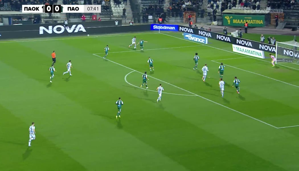 ΠΑΟΚ: Τεράστια ευκαιρία για τον Δικέφαλο του Βορρά όταν στο 8' μετά από πολύ ωραία κίνηση ο Τάισον θα δώσει στον Οζντόεφ, που έκανε το σουτ έκω από την περιοχή, με την μπάλα να σταματάει στο οριζόντιο δοκάρι του Κότσαρη, ενώ στη συνέχεια η προσπάθεια του Μεϊτέ θα περάσει λίγο έξω.