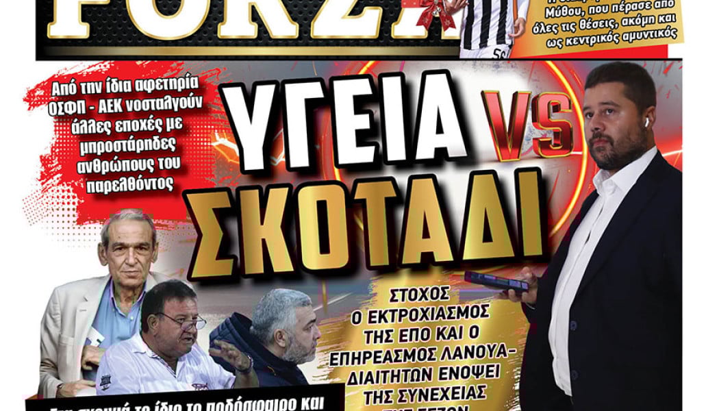 Κεντρικός τίτλος της εφημερίδας είναι το «ΥΓΕΙΑ VS ΣΚΟΤΑΔΙ», με το ρεπορτάζ να εστιάζει –όπως σημειώνεται– στον στόχο του εκτροχιασμού της ΕΠΟ και στον επηρεασμό Λανουά και διαιτητών, ενόψει της συνέχειας της σεζόν. Η Forza, η οποία πρόσκεται στον ΠΑΟΚ, μιλά ανοιχτά για ένα μέτωπο που στήνεται απέναντι σε όσους επιμένουν στη διαφάνεια και στη θεσμική κανονικότητα στο ποδόσφαιρο.