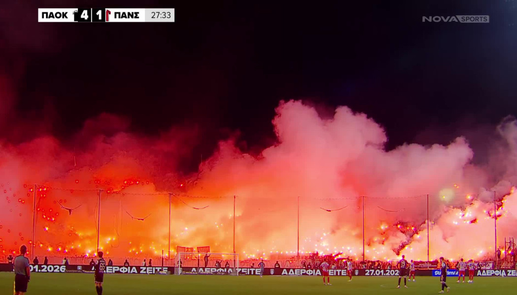 Η διακοπή διήρκησε για περίπου 7 λεπτά έως ότου καθαρίσει η ατμόσφαιρα από τα καπνογόνα ώστε να συνεχιστεί η αναμέτρηση.