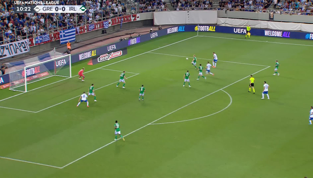 Ελλάδα - Ιρλανδίας: Η Εθνική Ελλάδας έφτασε κοντά στο να ανοίξει το σκορ στο 11', με τον Μασούρα να πιάνει το σουτ στην κίνηση και να αναγκάζει τον Κέλεχερ σε δύσκολη απόκρουση,
